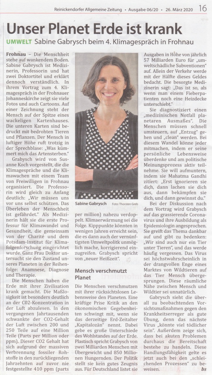 - 02.03.2020 / Berlin / 4. Klimagespräch – „Wie steht es um die Erde und die Menschen?“ mit Prof. Dr. Dr. Gabrysch, Charité, Potsdam-Institut für Klimafolgenforschung