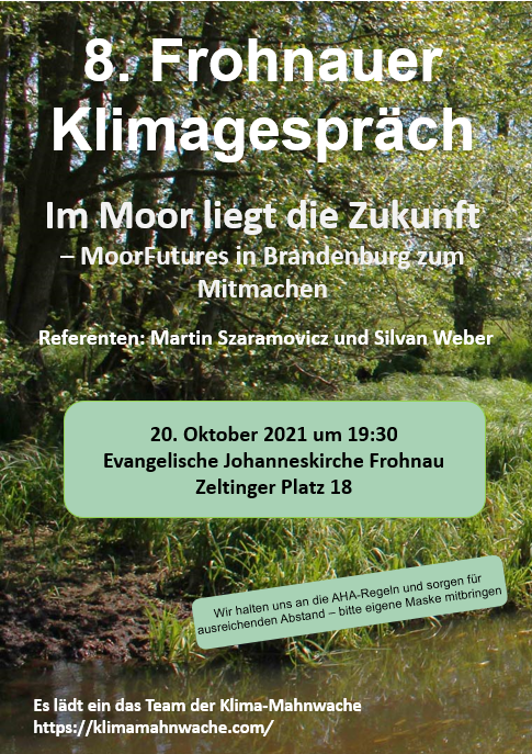 (ABGESAGT wegen Krankheit) 20. Oktober um 19:30 Uhr: 8. Klimagespräch in der Evangelischen Kirche Frohnau (Zeltinger Platz 18) mit Martin Szaramovicz und Silvan Weber zum Thema „Im Moor liegt die Zukunft – MoorFutures in Brandenburg zum Mitmachen“